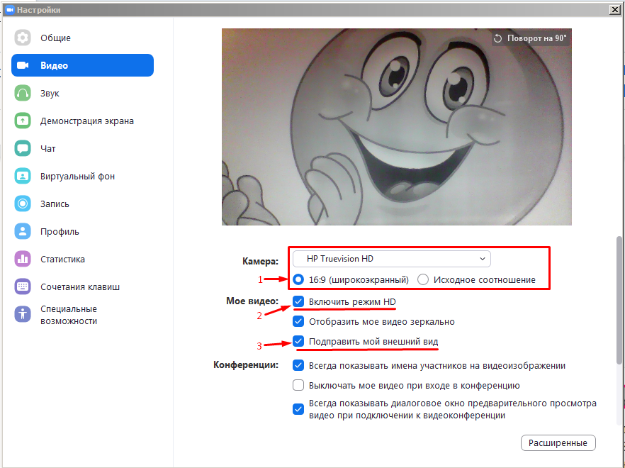 При желании настроить параметры видео перед включением видеокамеры, жмите по стрелочке справа от иконки и кликайте по пункту меню «Настройки видео». Если к ноутбуку подключена внешняя камера, выберите предпочтительное устройство. При скорости интернет-соединения свыше 5 Мбит/с включите режим HD. Активируйте функцию «Подправить мой внешний вид», если хотите освежить внешность.Не хотите вести онлайн-встречу из квартиры или офиса? Кликните по стрелке и щелкните по пункту меню «Выбрать виртуальный фон». Используйте одно из предложенных изображений или нажмите на иконку с плюсом и загрузите картинку с компьютера.