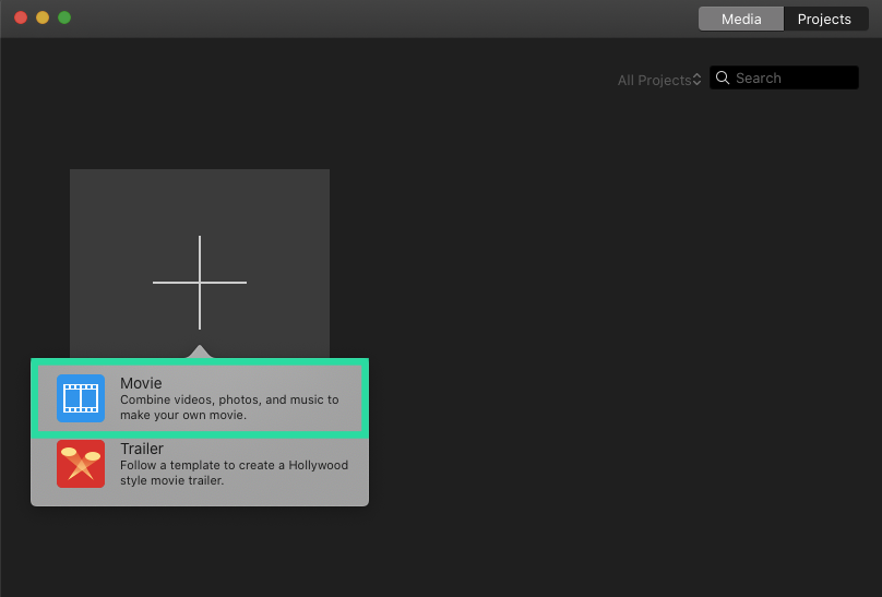 Шаг 2: Нажмите кнопку «Создать» (отмеченную значком «+») и выберите «Фильм».