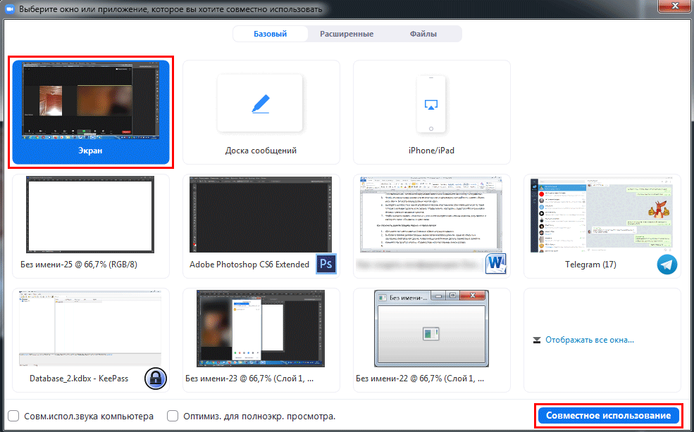 2. Выберите режим демонстрации: экран организатора целиком, одна из открытых программ или виртуальная доска, позволяющая участникам делать совместные пометки.