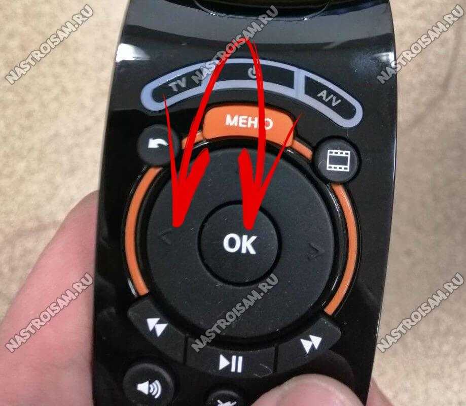 Включите телевизор и STB приставку. После этого возьмите в руки универсальный пульт. Зажмите одновременно кнопки ВЛЕВО и ОК и удерживайте до тех пор, пока индикатор «TV» не моргнёт два раз.