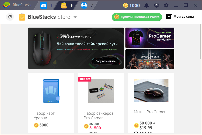 Одна из особенностей эмулятора — игровая валюта BlueStacks Pika Points, которую пользователь получает в награду за установку и запуск новых игр, а также за выполнение некоторых действий по повышению уровня. Накопленную валюту можно обменять на реальные призы, например, футболку «Pro Gamer», игровую мышь, коврик, набор стикеров, подарочные карты и прочее из того, что доступно в магазинах BlueStacks Store и BlueStacks Market.