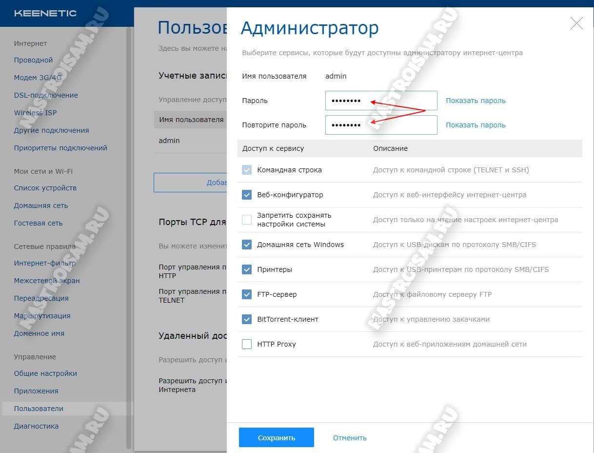 Пароль на доступ к настройкам желательно делать не менее 8-10 символов длиной и состоящим из цифр и букв разного регистра. Если Вы не пользуетесь различными функциями, вроде доступа через протоколы telnet и FTP — желательно убрать к ним доступ. Например, на роутерах Keenetic это делается в параметрах учётной записи.