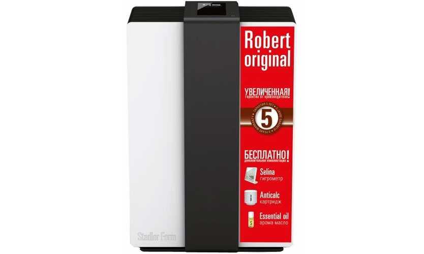 Это расширенная версия базовой модели Robert, которой присвоены международные награды. Скорость испарения составляет 13,2 л/сутки — это один из наивысших показателей для моек воздуха этого сегмента. Поэтому подходит для больших помещений – от 80 кв. м. Потребляет 7–30 Вт, мощность зависит от режима работы. На верхней панели расположен большой сенсорный дисплей 5,32 дюйма с датчиком движения. Комплектуется бактерицидным фильтром и фильтром для смягчения воды. В расширенную комплектацию входит аромамасло и гигрометр Selina little, который помогает контролировать уровень влажности, температуру. Цена последнего при отдельной покупке — порядка 2 тыс. рублей.
