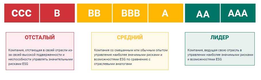MSCI делит компании на три категории: лидеры с рейтингом AA и AAA; компании со средними показателями — A, BBB, BB; и отстающие — B, CCC