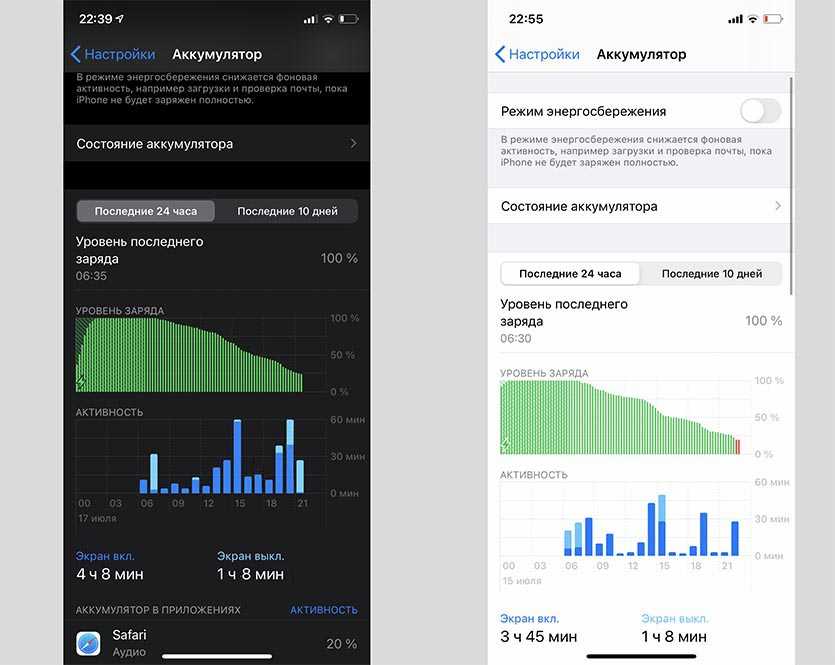 Замеры получились не совсем равномерными, но для сравнения нашел два практически одинаковых дня со схожими сценариями эксплуатации iPhone.