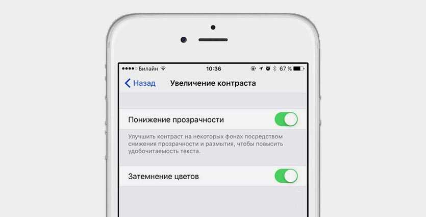 Еще одна настройка, которую часто рекомендуют отключать находится по пути Настройки — Основные — Универсальный доступ – Уменьшение движения/Увеличение контраста. На реальный прирост времени автономной работы после отключения рассчитывать не стоит.