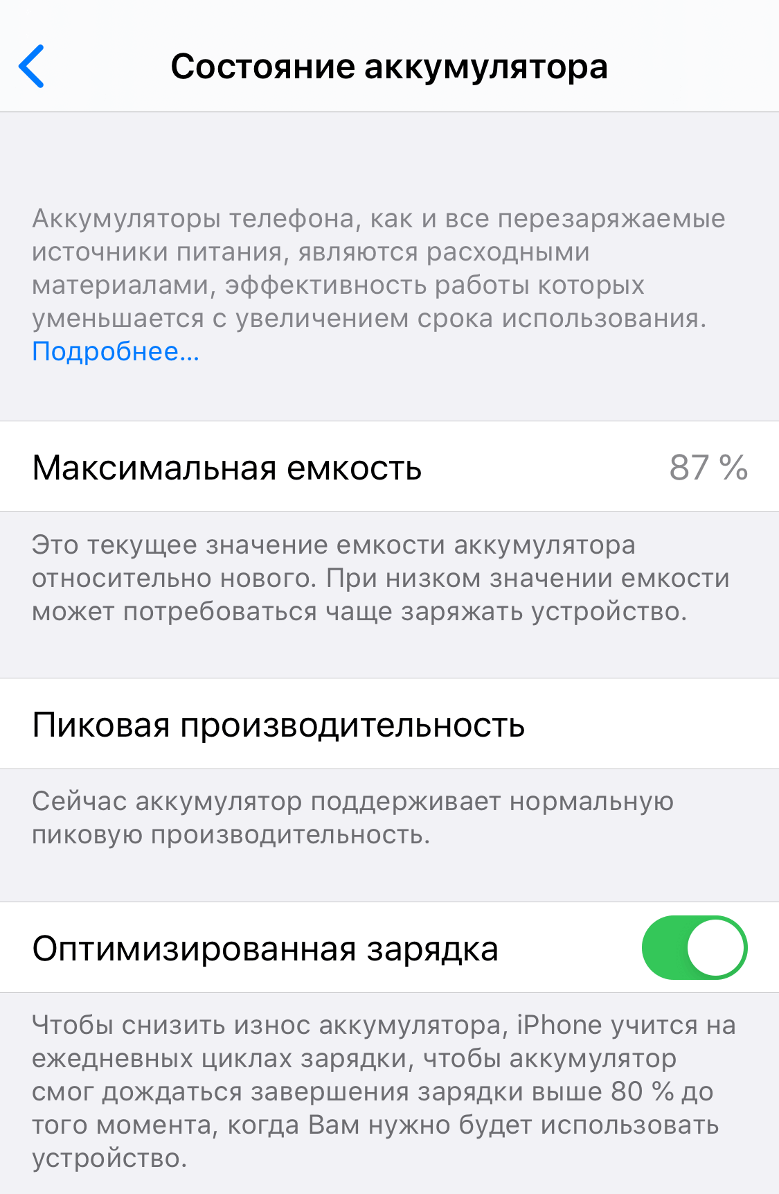 В моем случае максимальная емкость составляет 87%. Вроде бы не так плохо, но уже и не 100%, как вы понимаете. Возможно, сказалась зарядка неоригинальными кабелями и китайскими пауэрбанками. Но! При этом у меня бывают случаи, когда айфон выключается сам на 20% или даже 30% заряда. Потом я включаю его снова, а там уже осталось 5%. Такой вот нежданчик.