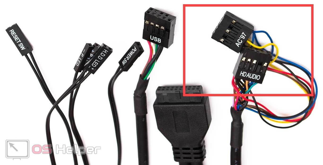 При появлении проблемы после сборки ПК первым делом нужно убедиться, что панель подключена. Для подключения используется колодка AC’97 или HD Audio, цельная или раздельная. Формат AC’97 устарел. Сейчас используется HD Audio, разъём которого на материнской плате обычно обозначается как «F_AUDIO» или нечто подобное.