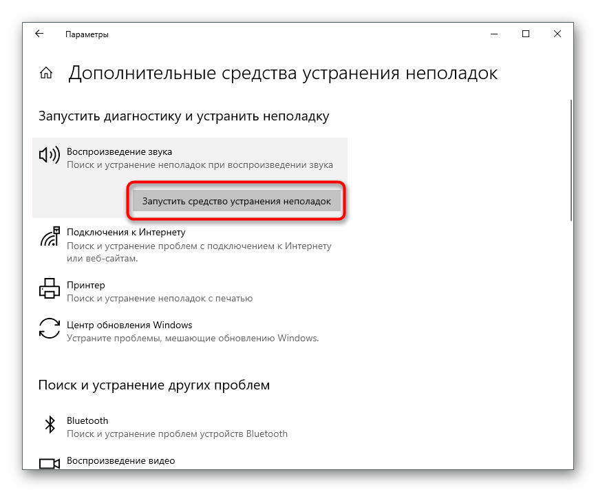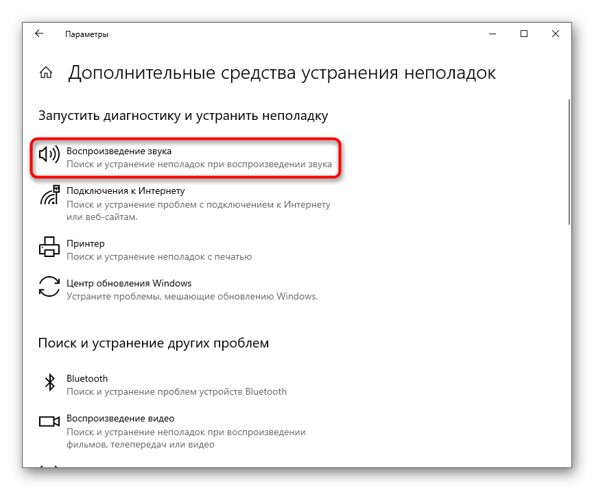 В блоке «Запустить диагностику и устранить неполадку» выберите пункт «Воспроизведение звука».