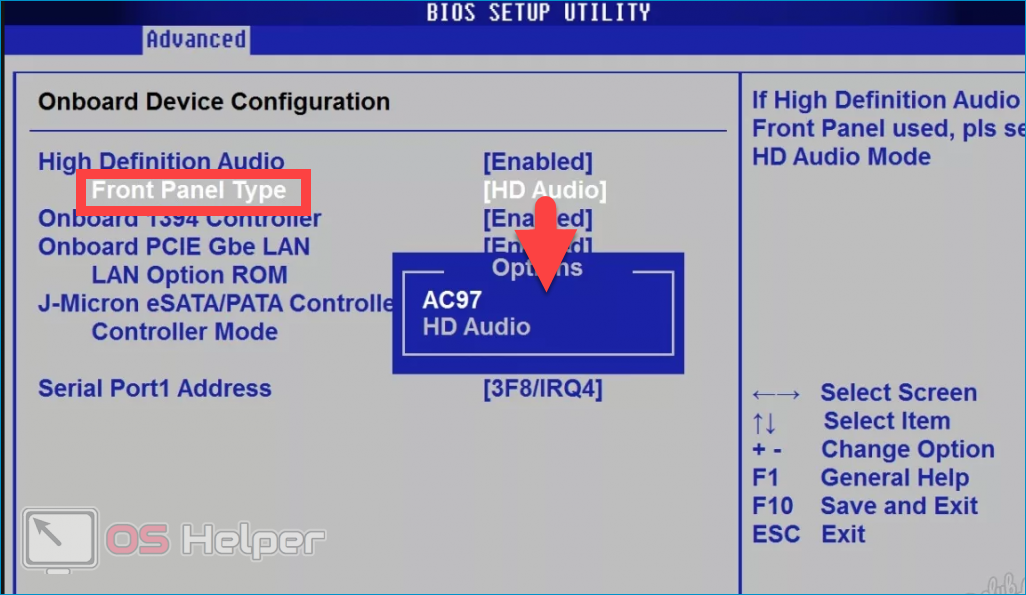 - Находим графу «Front Panel Type» (в названии может содержаться словосочетание «High Definition»), меняем значение на «AC97».