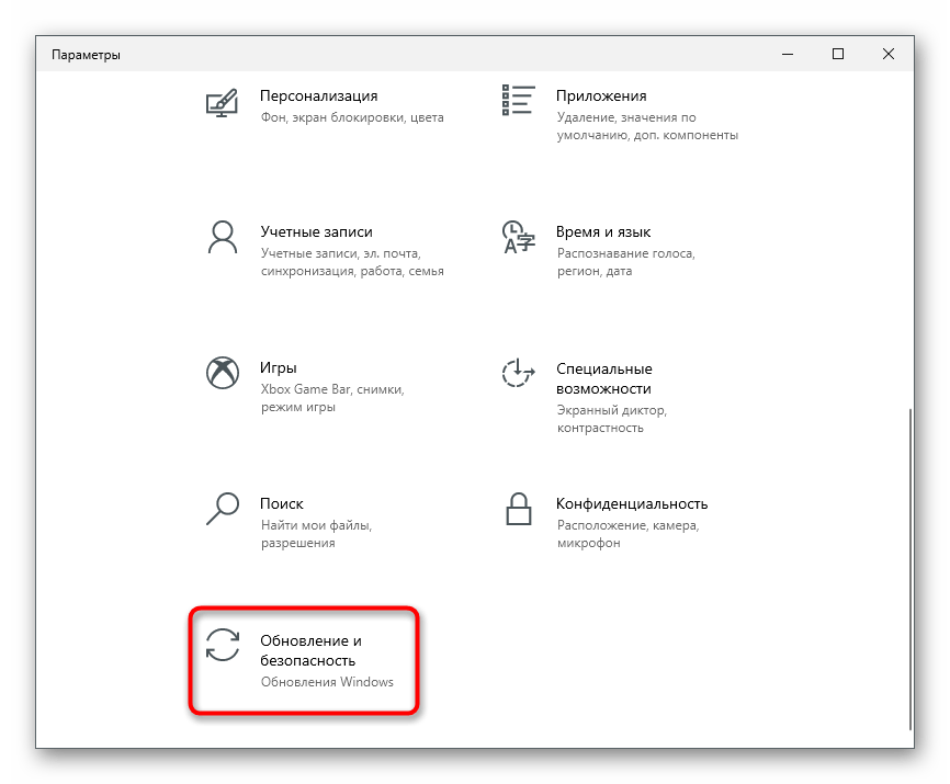 Прокрутите список до конца и нажмите по плитке «Обновление и безопасность».