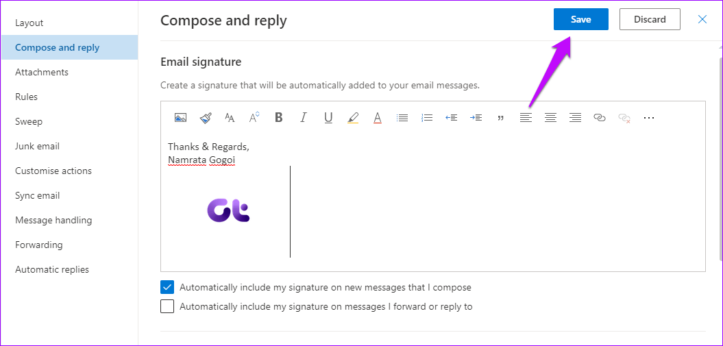 Шаг 2: Нажмите «Составить и ответить», чтобы открыть панель «Подпись» на правой панели. Как видно на скриншоте ниже, вы можете добавить все основные параметры форматирования, такие как полужирный, курсив, гиперссылка и т. Д.
