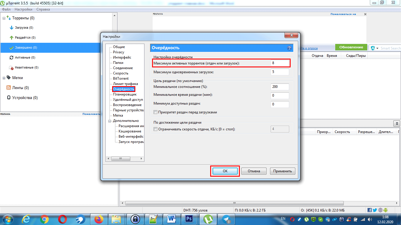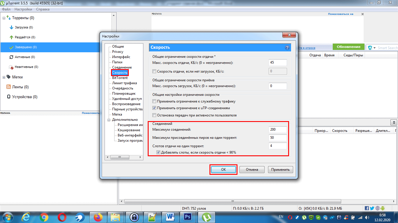 - Лимитируйте максимальное число соединений в сети и наибольшее количество присоединенных пиров на один торрент.