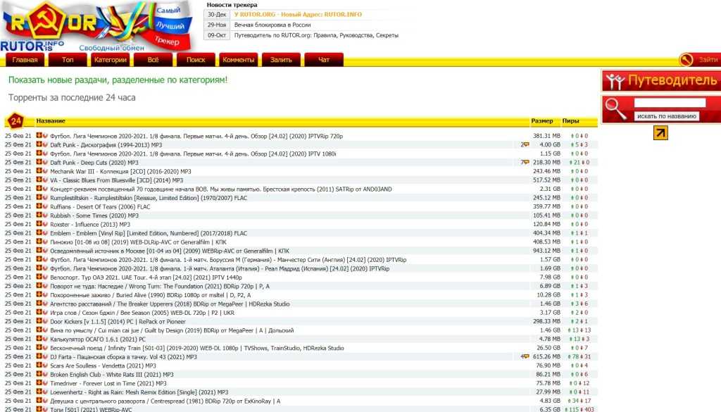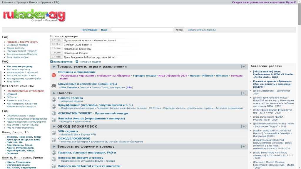 RuTraker – не нуждается в представлении, ведь это самый большой и знаменитый сайт с торрент-файлами в рунете. Сайт официально заблокирован в России, что позволило администрации публиковать файлы, ранее удаляемые по просьбе правообладателей.