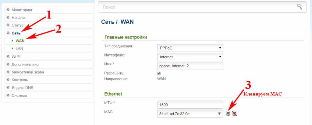 Когда вы будете настраивать вайфай роутер рекомендуется выполнить клонирование MAC адреса. Выполнить это можно в пункте «WAN», пункт «Ethernet». Напротив надписи MAC увидите MAC-адрес вашего вай фай роутера, для того чтобы заменить его нажмите кнопку «Клонировать». У вас он смениться на мак адрес вашего компьютера. Если необходим другой мак адрес, тогда просто сотрите и вбейте руками необходимый вам MAC. Для чего это нужно спросите вы? Дело в том, что многие провайдеры в целях безопасности, когда подключают к интернету нового клиента, фиксируют мак адрес вашего устройства, на котором настраивают интернет. И в случае, если у вас поменялся гаджет, вам нужно старый мак адрес внести на новое устройство. Или позвонить в техподдержку, оператор сможет изменить мак адрес на сервере.