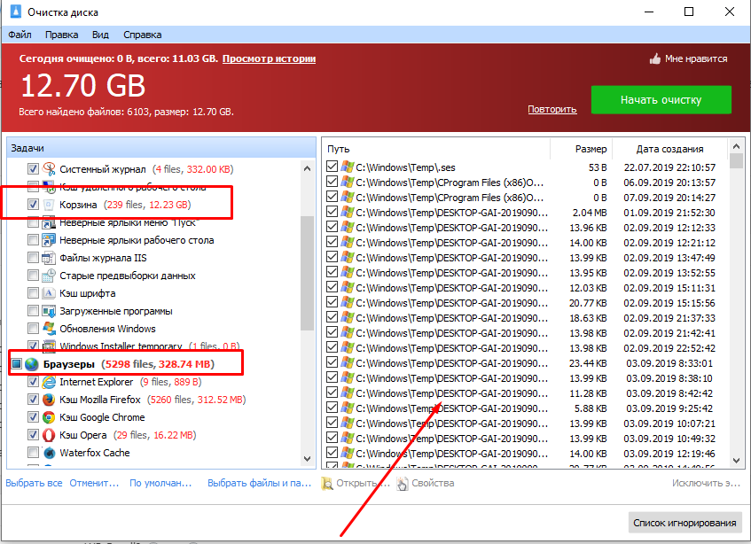 - В соответствующем меню проставить «галки» напротив тех пунктов, которые следует удалить, не забыв отметить строку «Временные файлы».
