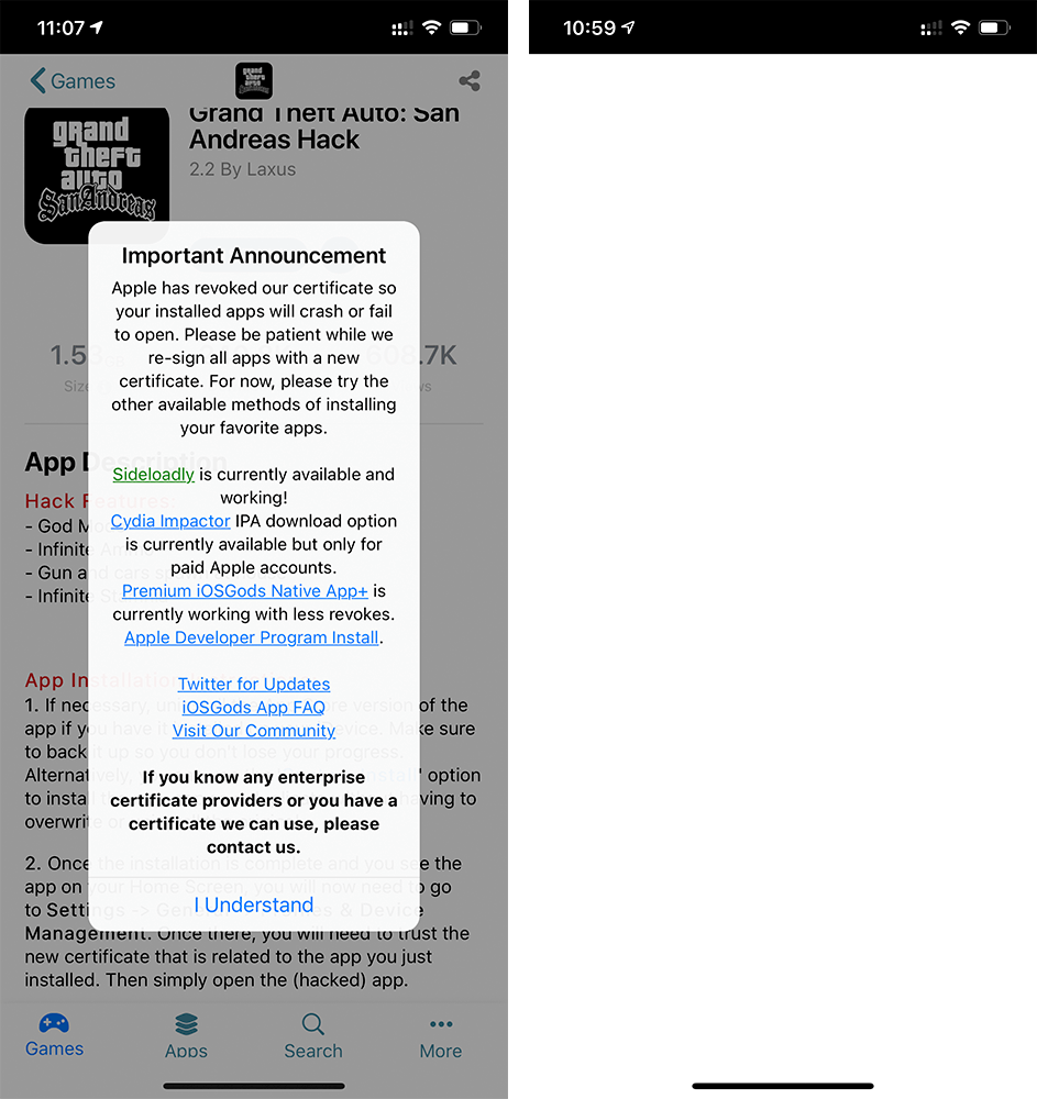 На это обратили внимание на Reddit. Соответствующее предупреждение появляется и при попытке установить что-то в iOSGods, а приложение Zestia вовсе показывает белый экран