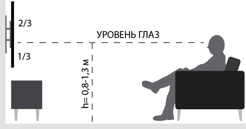 - если просмотр идет из разных точек помещения, из разных поз – сидя, стоя, лежа – выбираем среднее арифметическое, то есть все-таки на уровне сидящего человека;