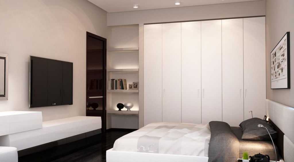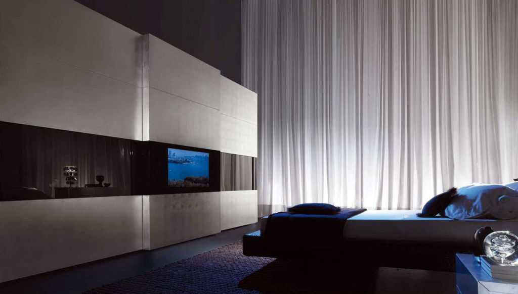 Такой размещение идеально подходит для спальни в стиле хай-тек, придаст ей оттенок футуристичности