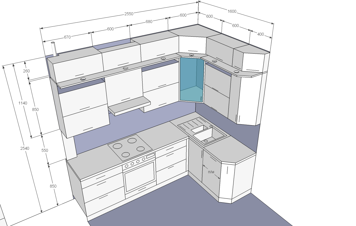 Типовые параметры навесных шкафчиков кухонной стенки находятся в таких пределах: