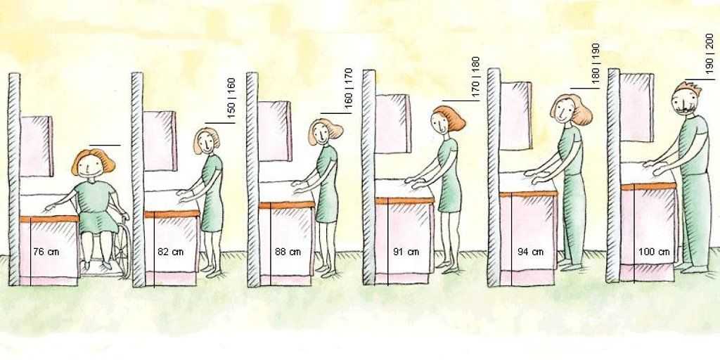 Обязательно учитывается рост взрослых хозяев. Измеряем именно средний показатель. При этом если на кухне регулярно готовит только один человек — то нет необходимости учитывать средний рост. Но все же чем ниже полочки, тем легче их эксплуатировать, вне зависимости от того, с какой целью они используются. Итак, если средний рост взрослых получился ниже 178 см — нижнюю кромку шкафчиков размещаем в 155 см от пола. При показателе в пределах 178—185 см секции вешаются на уровне 160 см. При большем среднем росте низ модулей должен находиться в коридоре 160—175 см, пропорционально полученному результату. Желательно, чтобы верхние полочки располагались не выше 20—25 см над головой самого низкого из взрослых. Полки выше 210 см от пола являются нефункциональными. Минимально низкое размещение навесного яруса мебели — 135 см, однако некоторые рекомендуют ставить их не ниже 145—150 см для людей среднего роста.