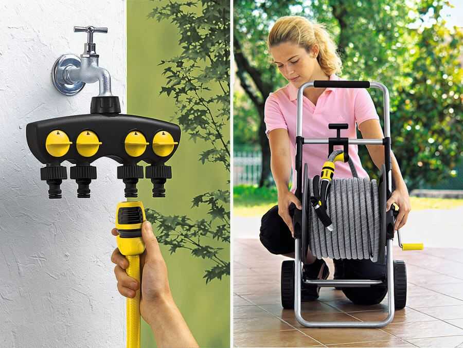 Через адаптер к внешнему водопроводному крану подключают сразу несколько шлангов. Для перемещения по участку длинных шлангов рекомендуется использовать специальную тележку.