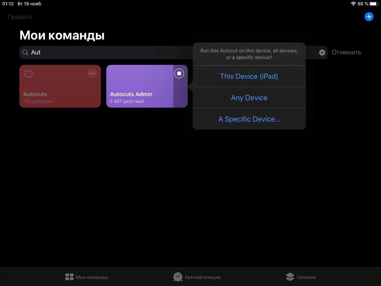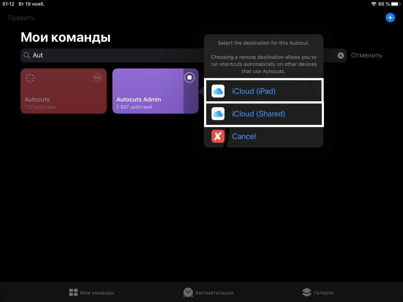 Если вы хотите, чтоб команды запускались только на вашем устройстве, нажмите «iCloud (⟨Ваше устройство⟩)». В противном случае, нажмите «iCloud (Shared)» (на другом устройстве должен быть запущен autocuts)
