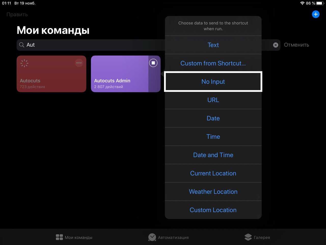 Выберите «No Input», если хотите, чтоб autocut не передавал входных данных командам.