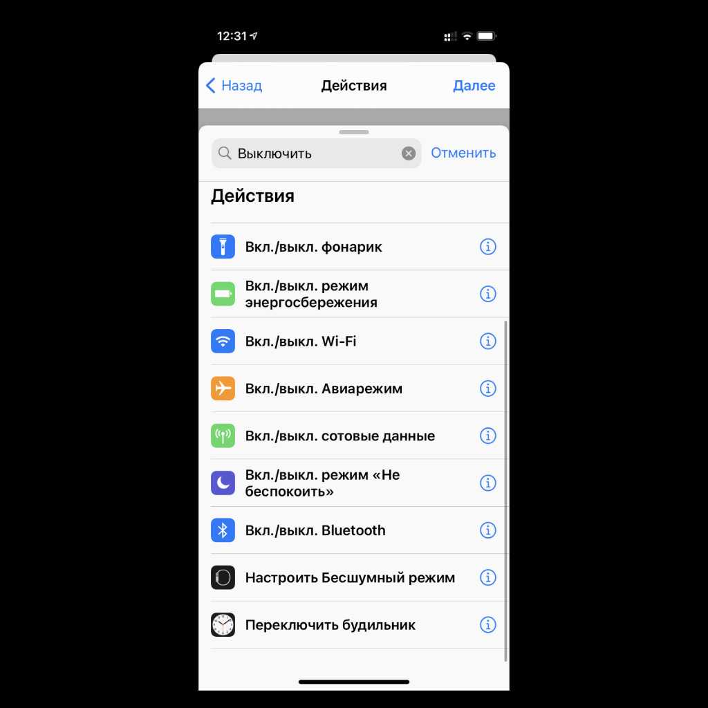 - Действия: «Вкл./выкл. Wi-Fi», «Вкл./выкл. сотовые данные», «Вкл./выкл. Bluetooth»