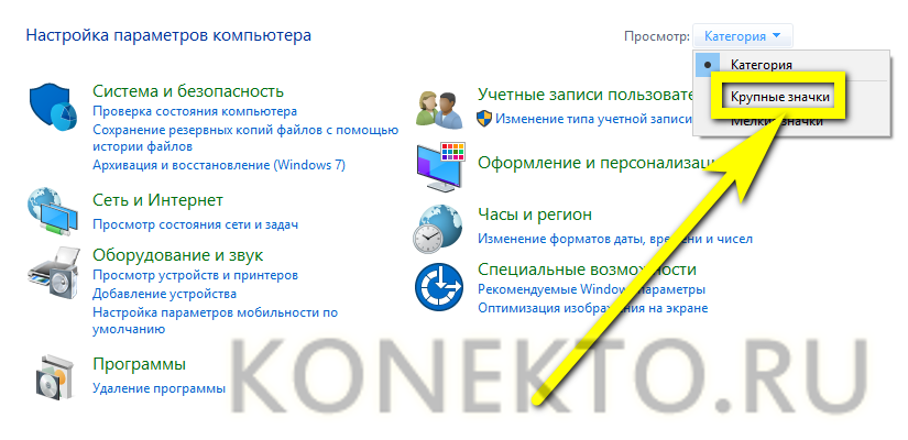 Открыть «Панель управления» и переключиться с «Категорий» на «Значки».