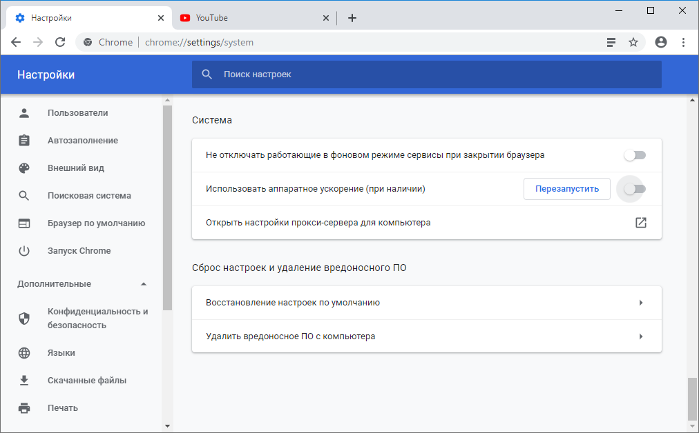 Если на Youtube не воспроизводится видео – вместо картинки отображается зеленый экран, отключите аппаратное ускорение в браузере.