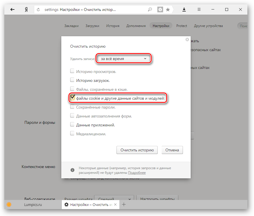 Иногда удаление кэшированных файлов может не помочь, тогда стоит попробовать очистить куки браузера. В этом случае нужно проделать все то же самое, что и в первый раз, только галочку нужно будет поставить рядом с параметром «Файлы cookie и другие данные сайтов и модулей».