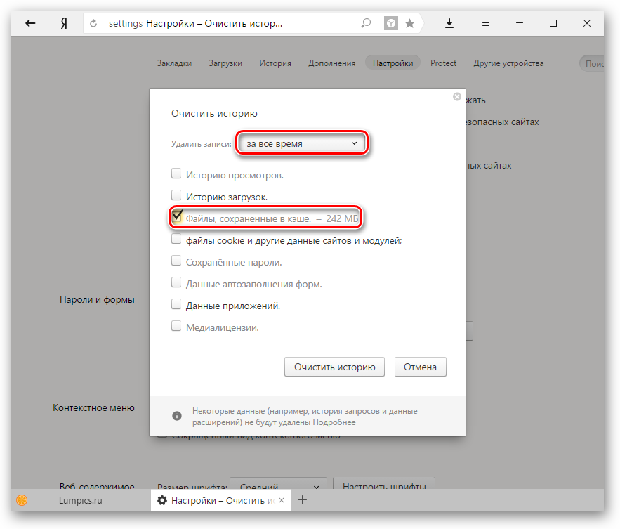 - Не зависимо от того через какой браузер вы открываете страницу видеохостинга, проблема может крыться в загруженности кэша. Это внутренняя память поисковика, которая хранит все ваши перемещения в интернете. Большая часть сохраненных объектов вам никогда больше не понадобится, поэтому их нужно удалять, чтобы они не тормозили работу сайтов. Сделать это можно в настройках поисковиков.