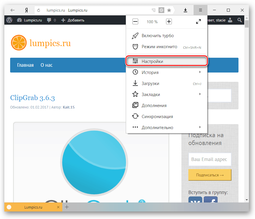 - Зайдите в меню Яндекс.Браузера и выберите «Настройки».