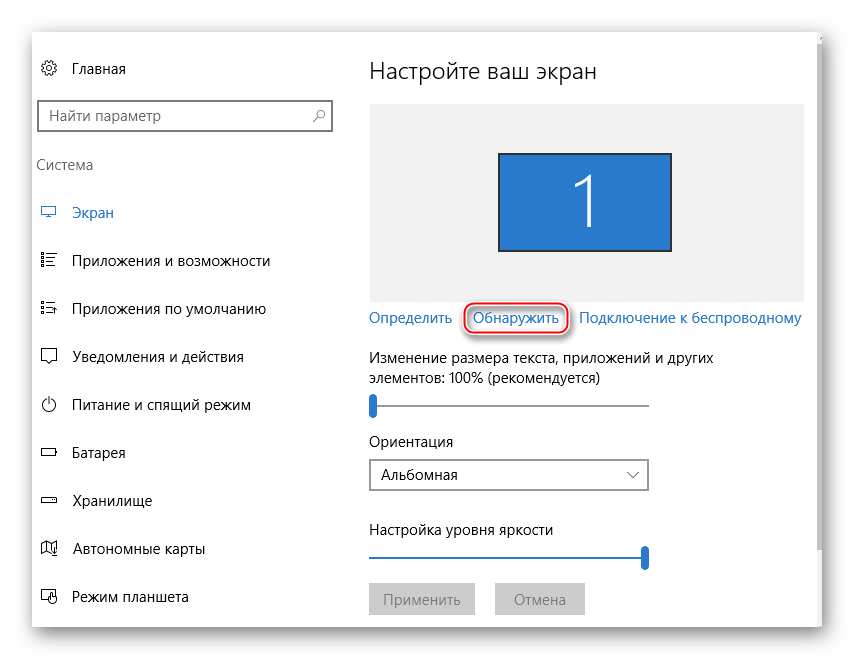 Далее придётся нажать «Обнаружить» или «Найти» (зависит от версии ОС), чтоб ПУ обнаружил телевизор или монитор, который уже подключён по HDMI. Нужная кнопка находится либо под окном, где схематично изображён дисплей с цифрой 1, или справа от него.