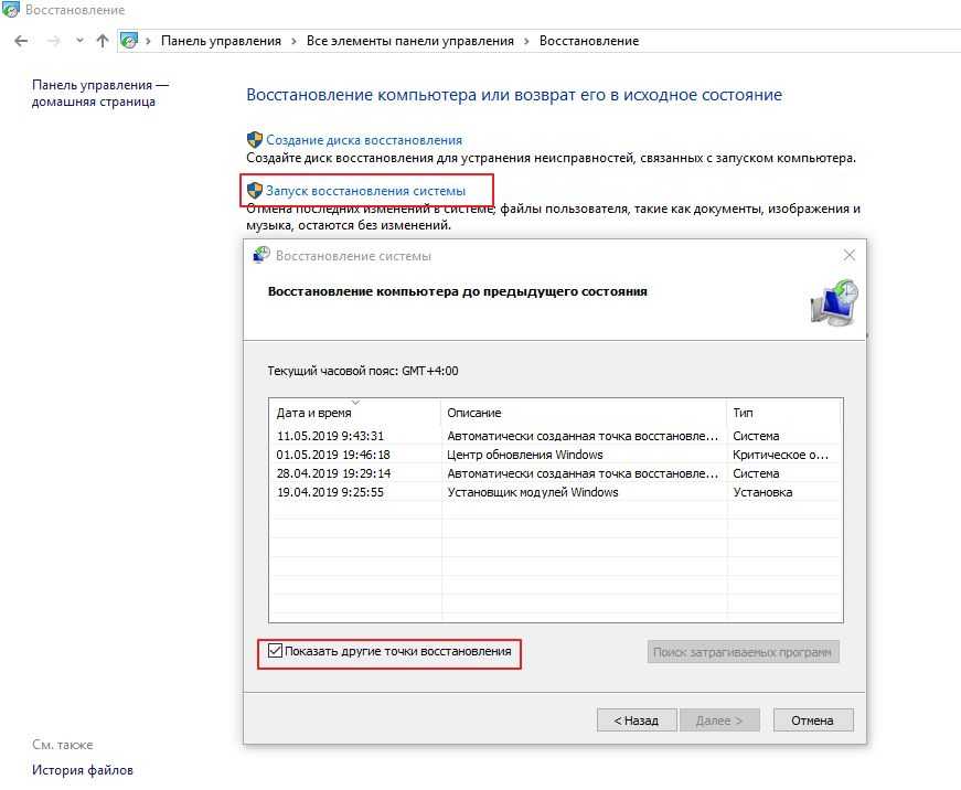 Исправить ситуацию можно, вернувшись к точке восстановления системы. Панель управления > Восстановление > Запуск восстановления системы. Нажмите Далее и установите галочку Показать другие точки восстановления.