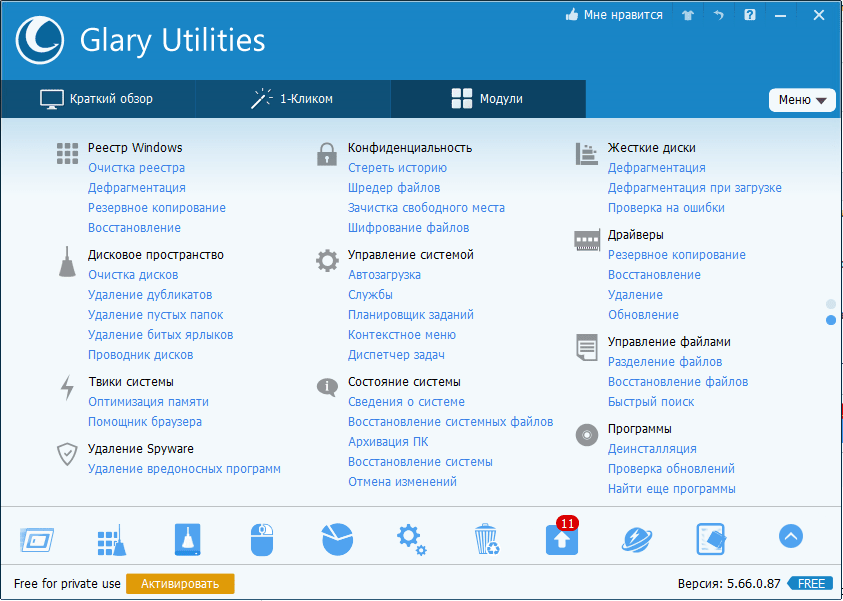 Раздел «Модули» содержит все компоненты (утилиты) программы, которые пользователь может запускать отдельно — по мере надобности. Сюда входят средства очистки, управления дисковым пространством, файлами и т. д. В нижней панели всех вкладок главного окна размещены кнопки быстрого вызова некоторых из них.