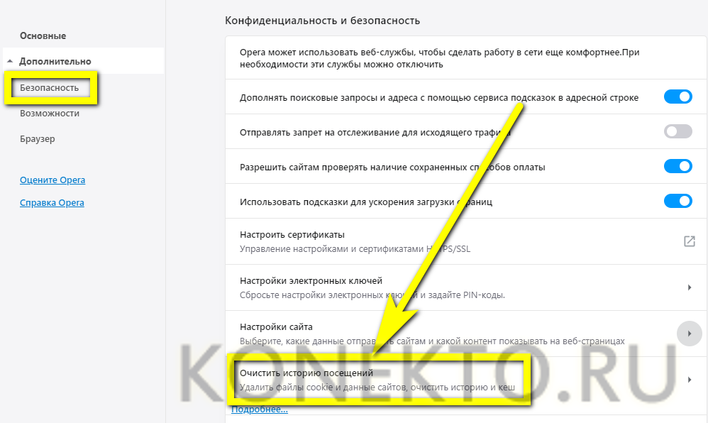 На вкладке «Безопасность» найти пункт «Очистить историю посещений» — он находится в разделе «Конфиденциальность и безопасность».