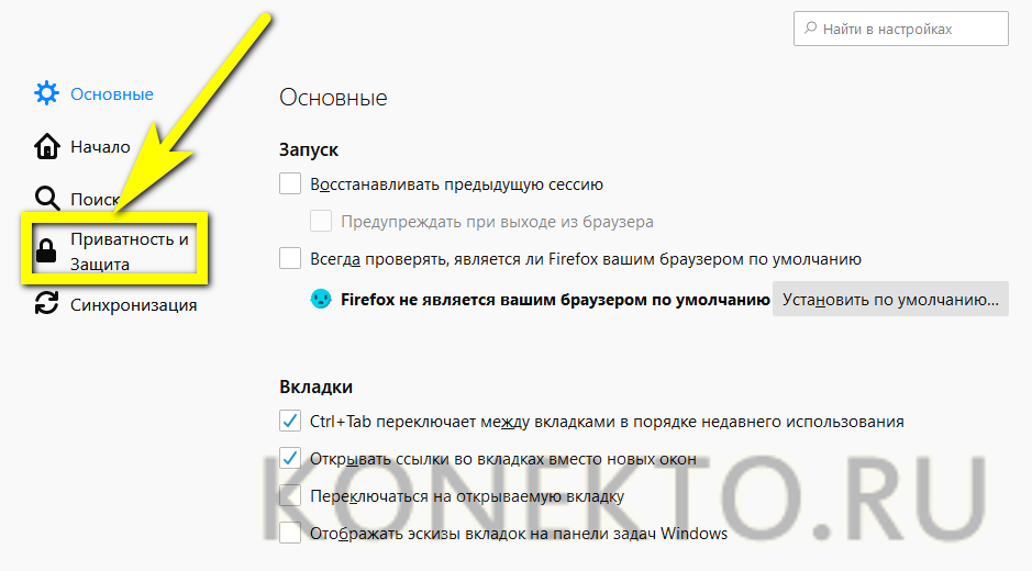 Открыть «Настройки», перейти на вкладку «Приватность и защита».