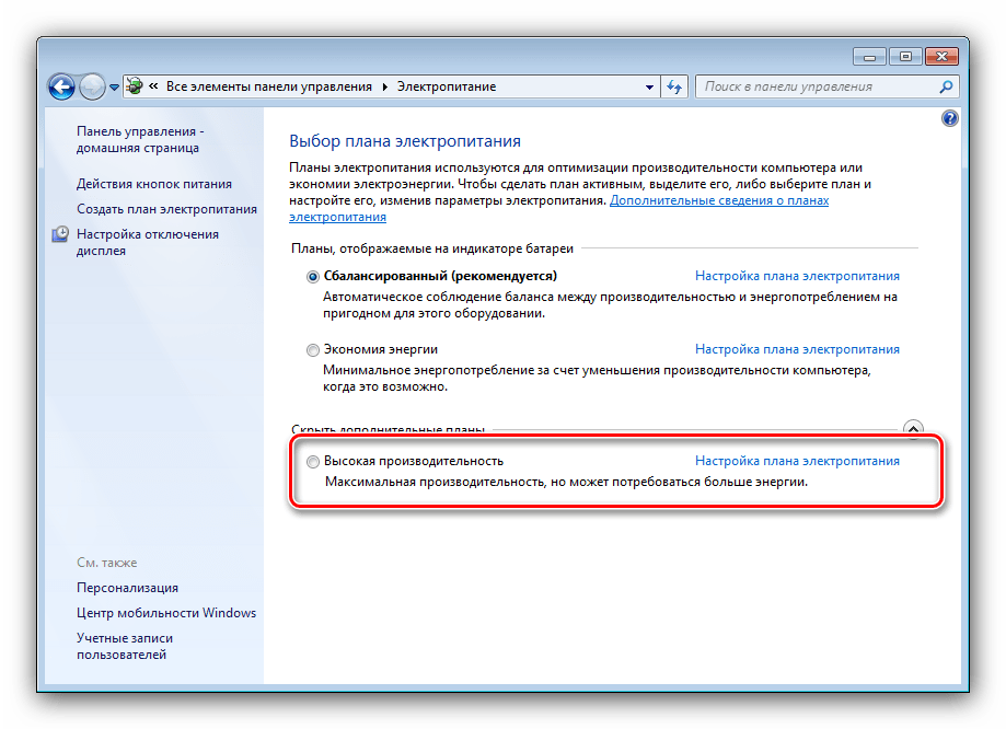 Для автоматического переключения питания в производительный режим отметьте план «Высокая производительность», после чего примените изменения.