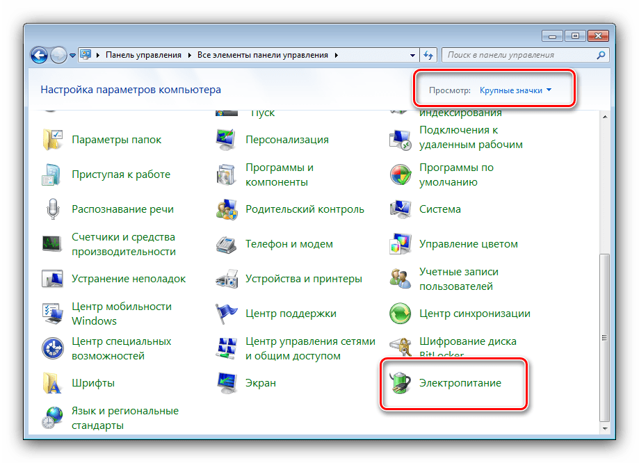 Переключите отображение в режим «Крупные значки», затем кликните левой кнопкой мыши по позиции «Электропитание».