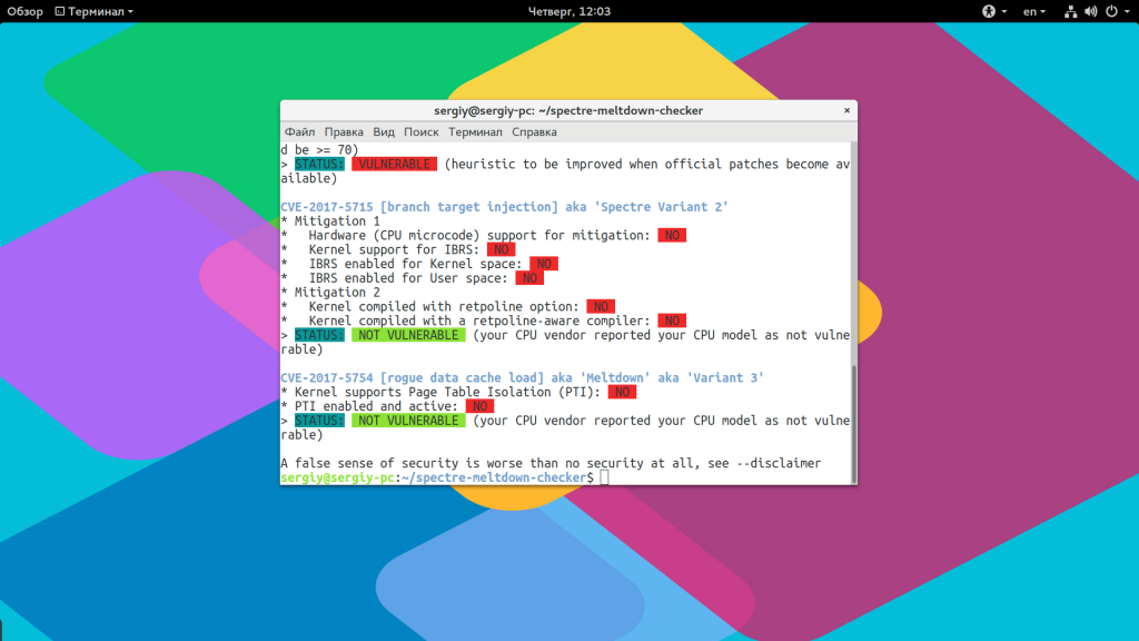 Опять же, если такой строчки нет — значит изоляция отключена и вы в опасности. Также существует скрипт, который можно использовать для проверки как Spectre, так и Meltdown. Для его загрузки вам понадобится git:
