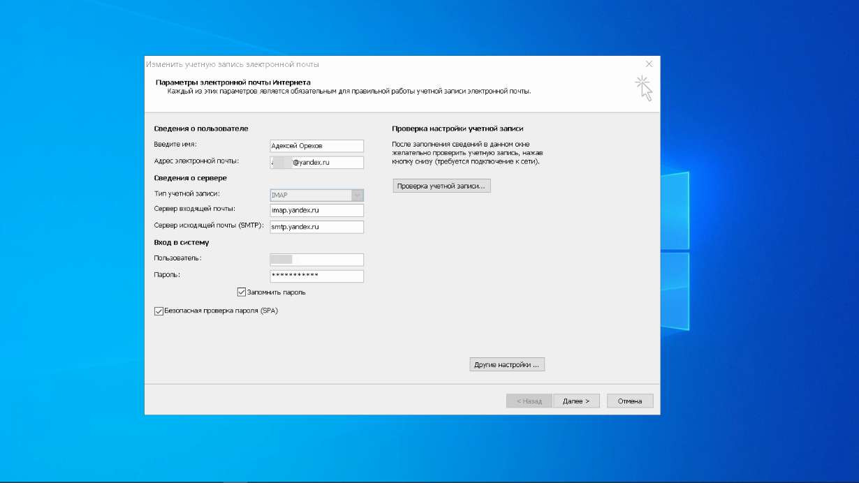 Пользователь и пароль – соответствующие данные вашего аккаунта на Яндексе. Если вы настраиваете получение почты с ящика вида login@yandex.ru, логином является часть адреса до знака @. Если вы используете Яндекс.Почту для своего домена, в качестве логина необходимо указывать полный адрес почтового ящика. Помечаем «Запомнить пароль» и переходим в «Другие настройки».