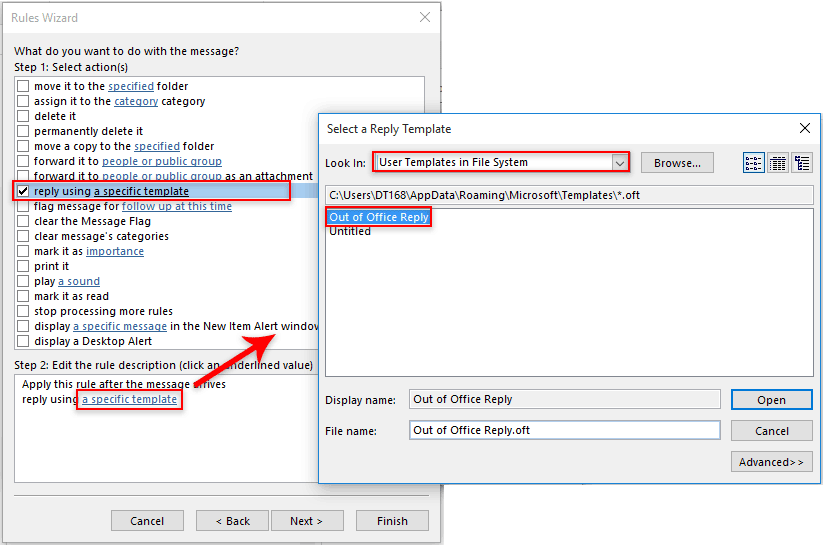 6. Затем в выбранных действиях Мастер правил, наведите на ответ с использованием определенного шаблона вариант в Шаг 1 поле, а затем щелкните «Конкретный шаблон» ссылка в шаг 2 коробка. в Выберите шаблон ответа диалоговое окно, выберите Пользовательские шаблоны в файловой системе из Заглянуть раскрывающийся список, выберите шаблон автоответчика, созданный на шаге 1, а затем щелкните значок Откройте кнопка. Нажмите Далее кнопку, чтобы продолжить. Смотрите скриншот: