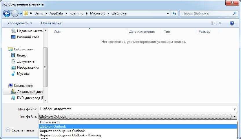 В окне сохранения элемента выбираем «Шаблон Outlook» в списке «Тип файла» и вводим имя нашего шаблона. Теперь подтверждаем сохранение нажатием кнопки «Сохранить». Теперь окно нового сообщения можно закрыть.
