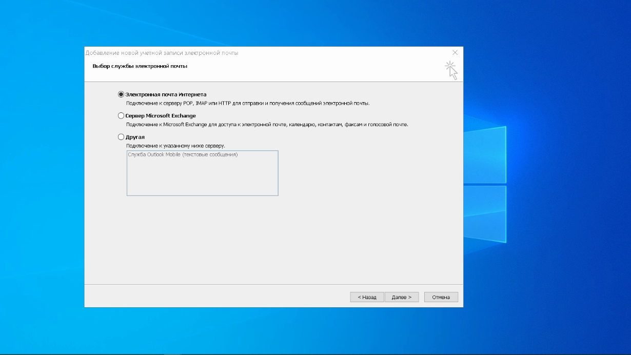 Теперь выбираем службу электронной почты. В нашем случае это «Электронная почта интернета».