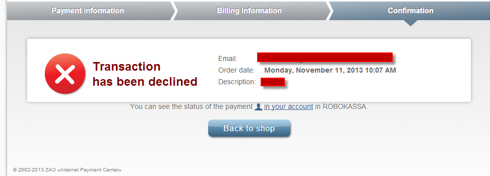 Но у меня был случай, когда оплата просто не проходила. Робокасса писала сообщение — оплата отменена. Я не знал, в чем причина. В личном кабинете найти ошибку мне не удалось.