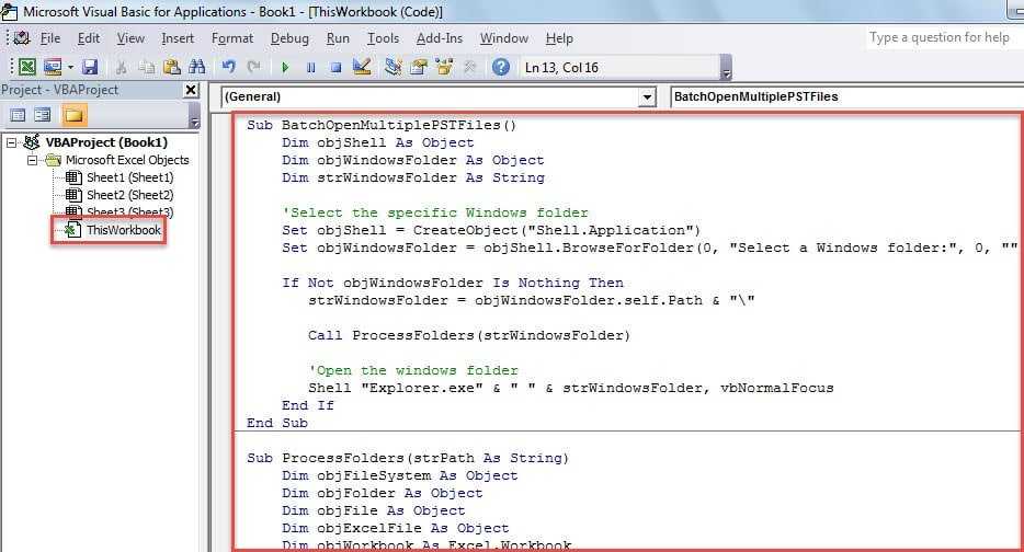 Sub BatchOpenMultiplePSTFiles () Dim objShell As Object Dim objWindowsFolder As Object Dim strWindowsFolder As String 'Выберите конкретную папку Windows Set objShell = CreateObject ("Shell.Application") Установите objWindowsFolder = objShell.BrowseForFolder (0: ", выберите папку Windows 0, "") Если не objWindowsFolder - это ничего, тогда strWindowsFolder = objWindowsFolder.self.Path & "\" Call ProcessFolders (strWindowsFolder) 'Откройте папку Windows Shell "Explorer.exe" & "" & strWindowsFolder, vbNormalFocus End If End Sub Sub ProcessFolders (strPath As String) Dim objFileSystem As Object Dim objFolder As Object Dim objFile As Object Dim objExcelFile As Object Dim objWorkbook As Excel.Workbook Dim strWorkbookName As String Set objFileSystem = CreateObject ("ScriptingFileSystem) (" ScriptingFileSystem) strPath) Для каждого objFile в objFolder.Files strFileExtension = objFileSystem.GetExtensionName (objFile) Если LCase (strFileExtension) = "xls" или LCase (strFileExtension) = "xlsx" Затем установите objExcelFile = objFile Установить objWorkbook = Application.Workbooks.Open (objExcelFile.Path) strWorkbookName = Left (objWorkbook.Name, (Len (objWorkbook.Name) - Len (strFileExtension)) -1) objWorkbook.ExportatAsFixedFixedFixedFixedFixedFixedFixedFixedFixedFixedPDF, Имя файла: = strPath & strWorkbookName & ".pdf"objWorkbook.Close False End If Next 'Обрабатывать все папки и подпапки Если objFolder.SubFolders.Count> 0 Тогда Для каждой objSubFolder в objFolder.SubFolders If ((objSubFolder.Attributes And 2) = 0) And ((objSubFolder.Attributes And 4 ) = 0) Тогда ProcessFolders (objSubFolder.Path) End If Next End If End Sub