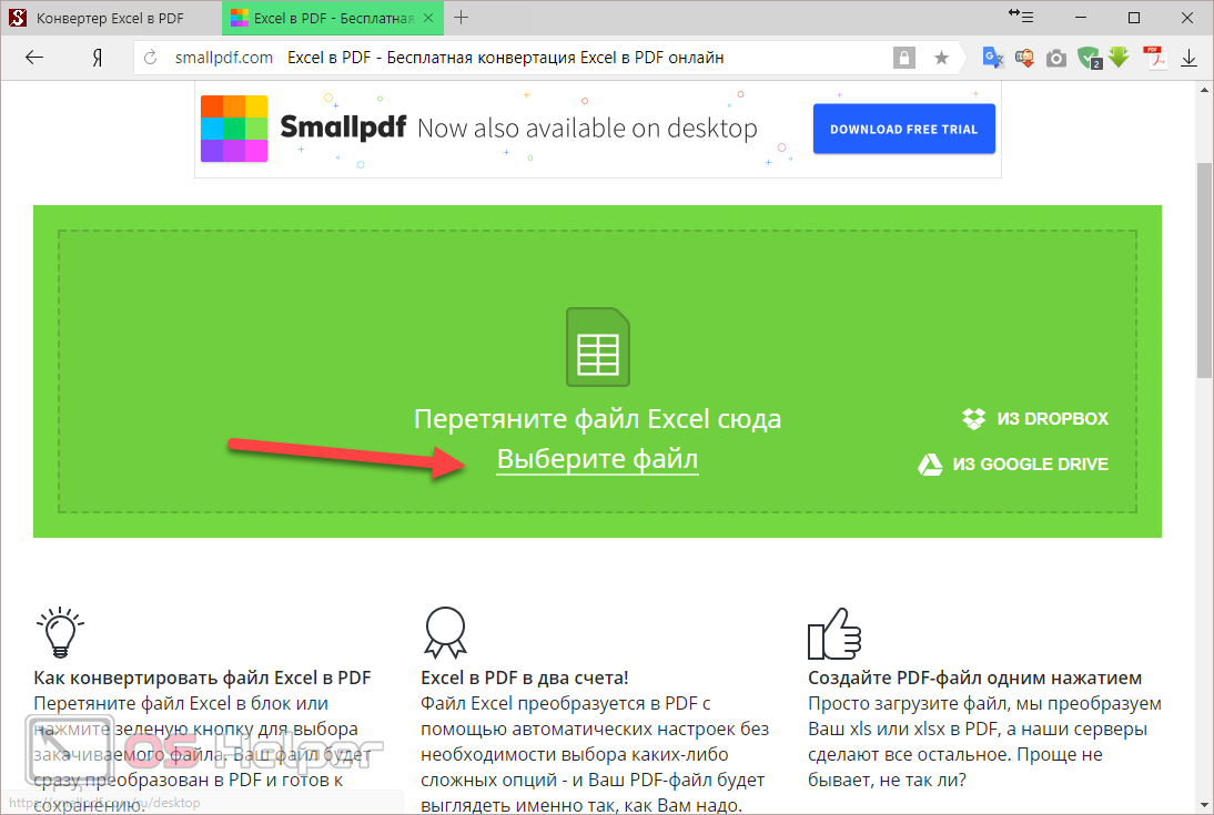 - Нажмите на ссылку «Выберите файл» либо перетяните книгу Excel прямо в эту зеленую область.