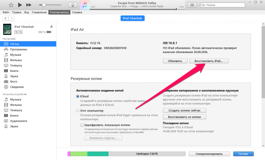 Если iPad выключился и не реагирует на прикосновения после джейлбрейка, обновления, установки предыдущей версии iOS, или на экране висит яблоко, то нужно делать восстановление устройства. Но прежде чем приступать к этой процедуре, убедитесь, что на компьютере или в iCloud хранится резервная копия данных: при прошивке вся информация с Айпада будет удалена.